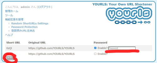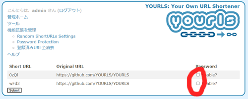 パスワードを入力して左下のsubmitボタンをクリック。その後管理画面に戻るのでリンクをコピーする。